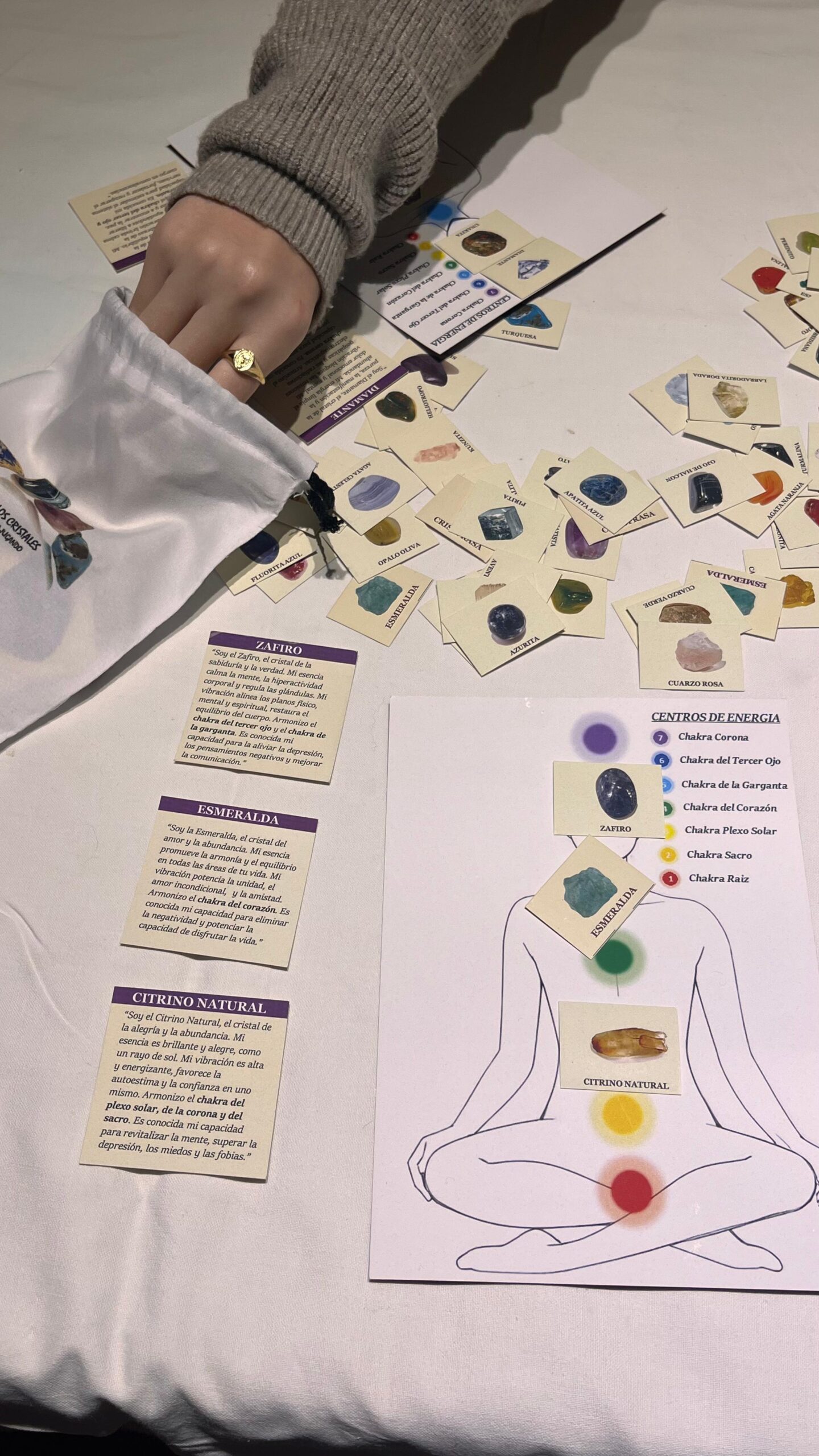 Varios Cristales por Chakra: Puedes ubicar más de un cristal en un mismo chakra. Si varios cristales armonizan un mismo centro, coloca las tarjetas pequeñas una al lado de la otra. Juntos, irradiarán su energía a ese chakra y a todo tu campo energético.