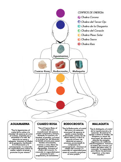 2. ANUNCIA EL NOMBRE del cristal, las palabras que describen su esencia, y qué centros de energía (chakras) ayuda a armonizar.